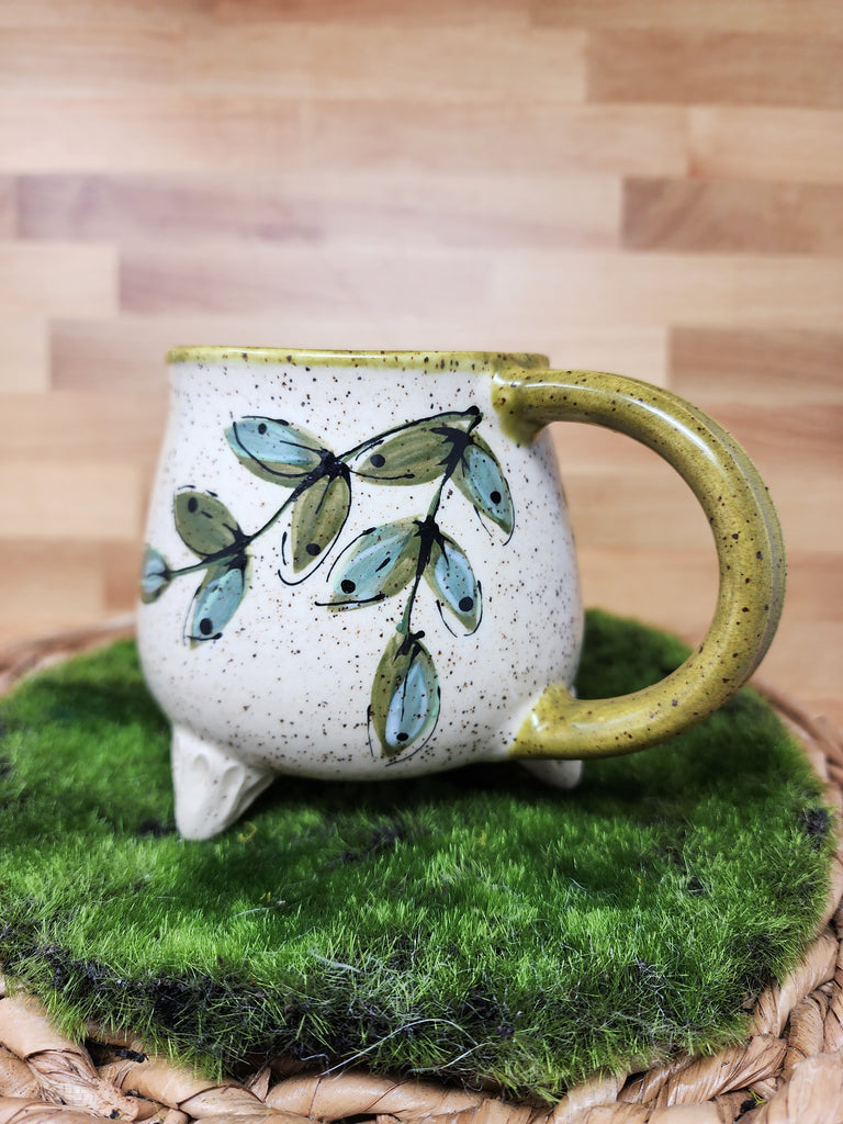 This mug is made from stoneware clay, thrown on the wheel. While the mug is firming up a bit so it is able to be handled I work on making the mushrooms and pulling handles. Once it has firmed up I attach it's magical fungi, it's feet and other clay details. Then once it's handle is attached I set it aside to dry slowly. Once dry it is off to the kiln for it's first round of firing.